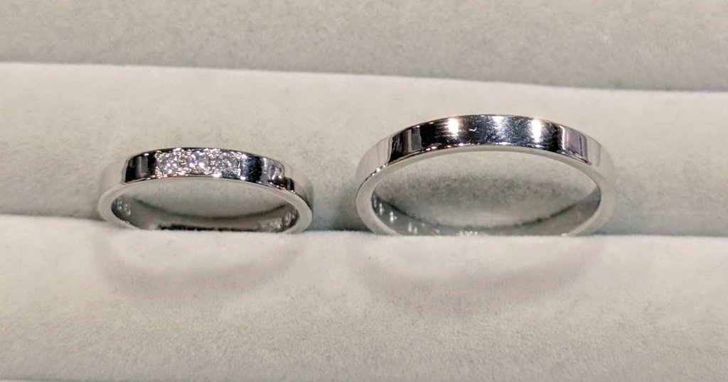 Pt平打ちリングで 女性用リングに3個のメレダイヤを入れました。